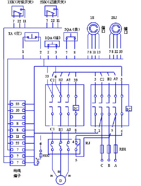 電器控制原理圖四、控制線路接線圖五。紅色按鈕TA停,綠色按鈕1QA是起動(dòng),黃色按鈕2QA是點(diǎn)動(dòng)控制;時(shí)間繼電器1SJ和2SJ分別控制長(zhǎng)短工位時(shí)間;兩個(gè)行程開關(guān),一個(gè)起定位用,一個(gè)起提前接通銜接過(guò)渡作用,過(guò)渡開關(guān)應(yīng)超前安裝3-5度,使其超前動(dòng)作。