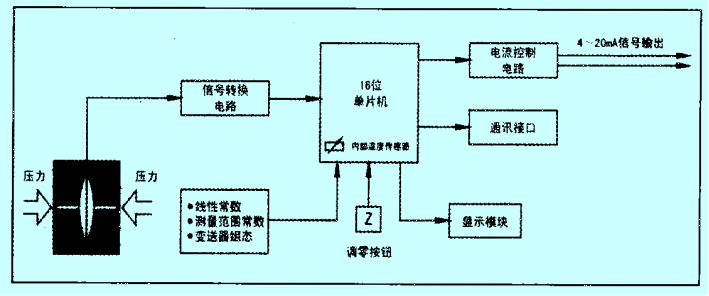 介質(zhì)壓力通過隔離膜片和硅油傳遞給位于δ室中心的測量膜片,測量膜片是一個張緊的彈性元件,隨它兩邊的壓力差而產(chǎn)生相應位移。測量膜片的位移與差壓成正比,最大位移為0.1mm,由它兩側(cè)的電容極板檢測。如電氣原理框圖所示,壓力或差壓產(chǎn)生的電容差經(jīng)數(shù)字化信號轉(zhuǎn)換,變?yōu)轭l率信號送到微處理器,經(jīng)過微處理器運算處理后作為一個電流控制信號送到電流控制電路,轉(zhuǎn)化為4-20mA模擬電流輸出。