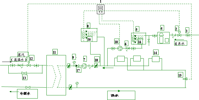 15 、溫度傳感器 16 、水位傳感器 17 、止回閥 18 、補(bǔ)水泵