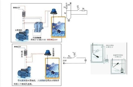 3、使用“黑色”和“褐色”的電線:浮球在下水位時,接點是接通的狀態(tài),浮球在水位時,接點是不通的狀態(tài)。